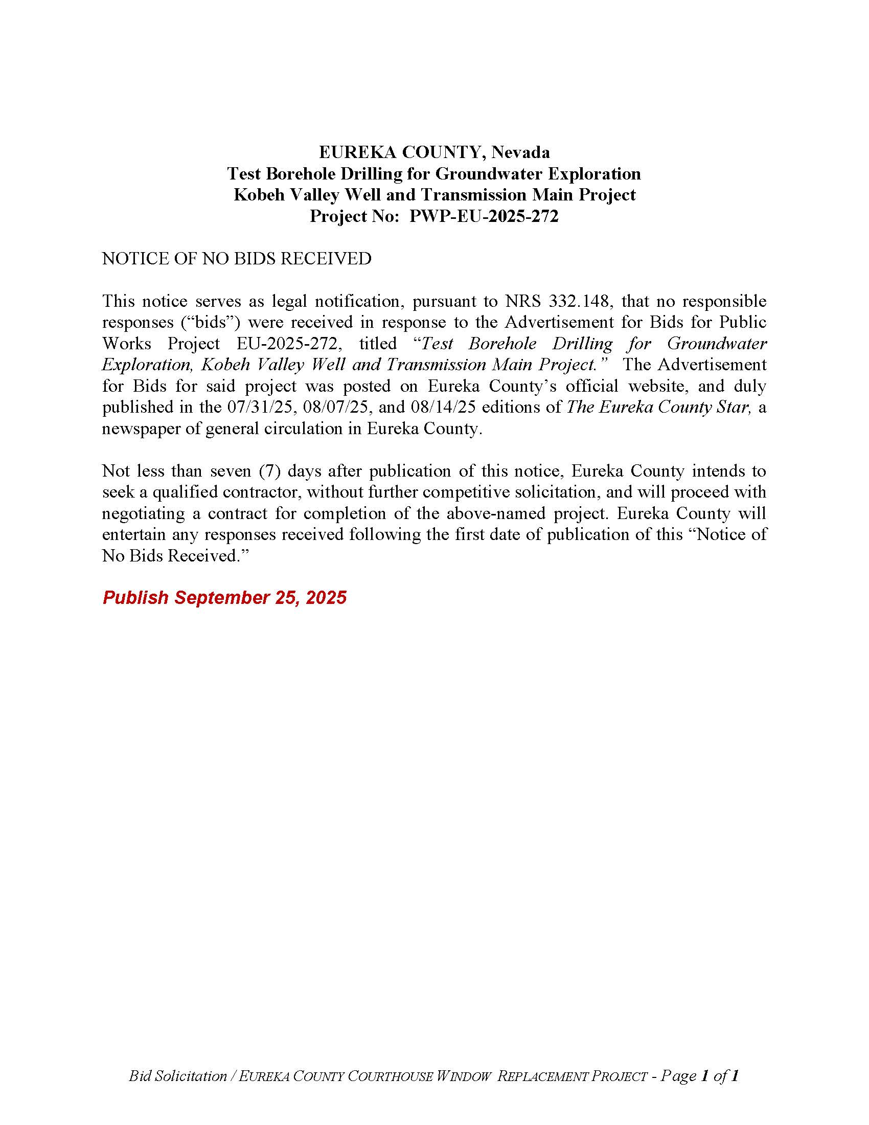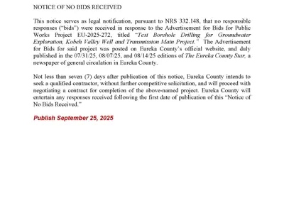 Notice of No Bids Received Kobeh Valley Well and Transmission Main Project