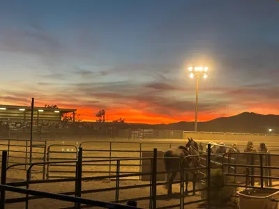 Annie captures a stunning summer sunset at the Eureka County Fair, where the arena glows under bright lights as the sky ignites in vivid reds, oranges, and purples. Horses and fairgoers gather in the foreground, silhouetted against the glowing horizon. Her image beautifully conveys the energy of fair season and the quiet magic of summer evenings in Eureka County.