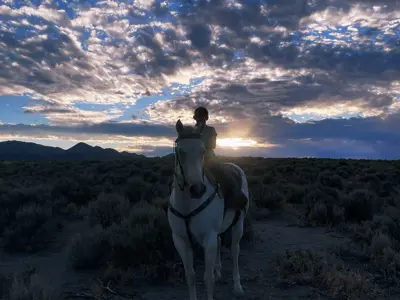 Remi’s photograph captures a breathtaking scene of rider and horse set against a dramatic Eureka County sky. The silhouette of the pair stands tall in the sagebrush as golden light breaks through the clouds, creating a powerful contrast of shadow and color. The image reflects the quiet strength of ranch life and the timeless bond between people, animals, and the land.